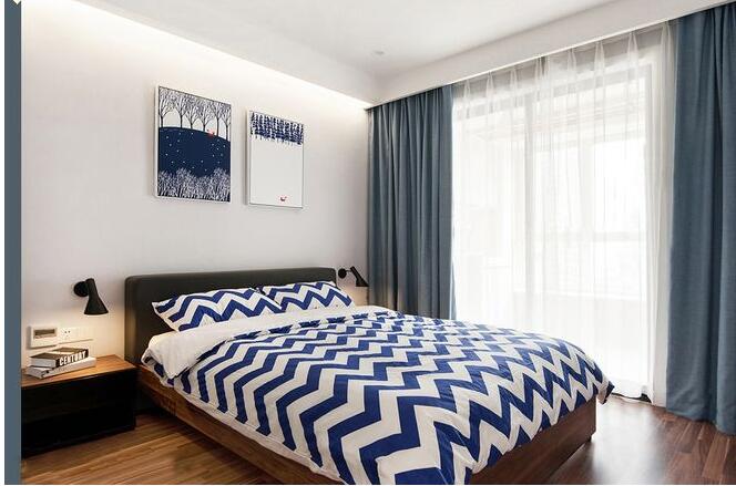 卧室中设计师在软装布艺上选了灰蓝色,还原本质的风格,背景画个性有趣味